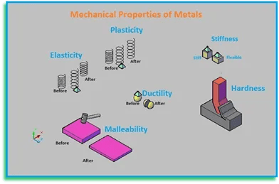 Some of the important mechanical properties of a metals are Brittleness, Creep, Ductility, Elasticity, Fatigue, Hardness, Malleability, Plasticity, Resilience, Stiffness, Toughness, Yield strength. Above mechanical properties of metals are explained below in brief.